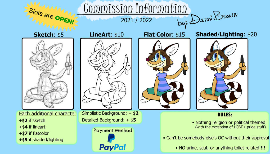 My rules and commission prices change occasionally or every once in a while. These are the current prices I have set up: